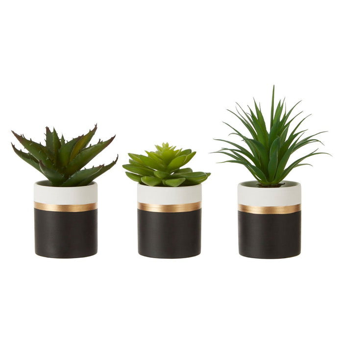 Add a nature inspired flair to the home with these easy to maintain faux green plants in miniature pots. This set of three mini succulents are individually arranged and feature lush green distinctive leaves. The plants are nestled in simplistic ceramic pots which have soft white and black shade, complemented with a gold finish decorative trim.