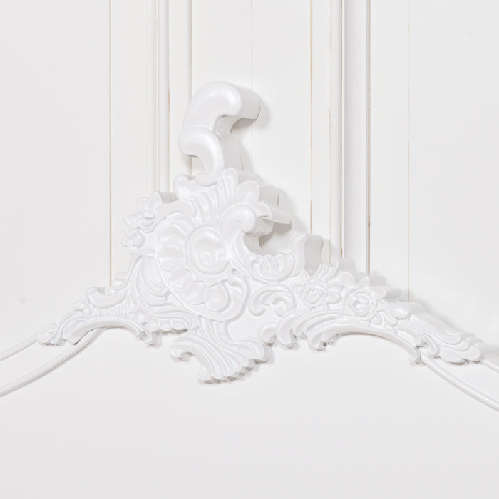 White 4ft6 double size freestyle headboard in a French antique style with detailed motif crown and curved edges.