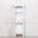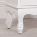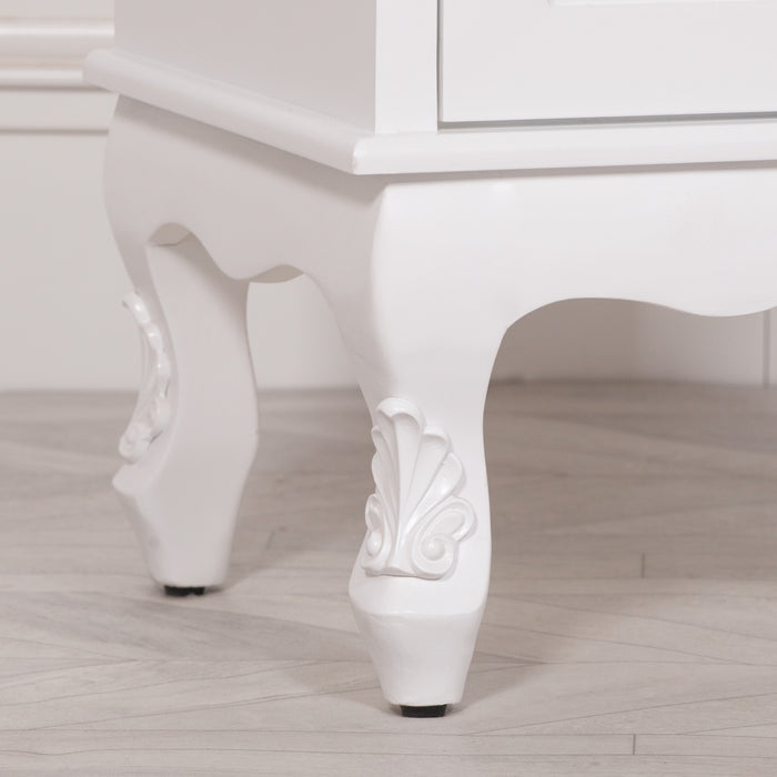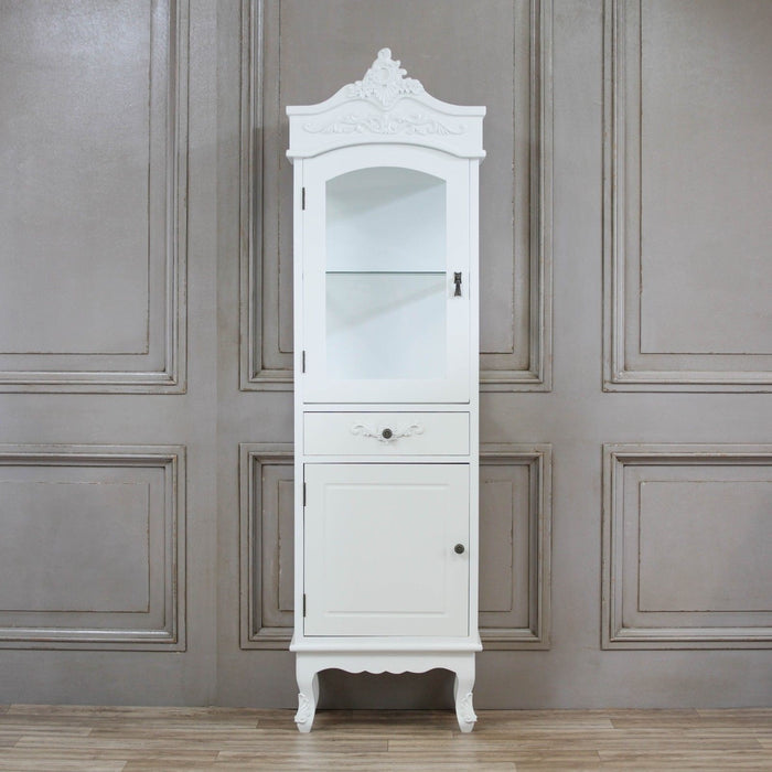 White display cabinet in a French antique style with a tempered glass shelf and intricate motif detailing.