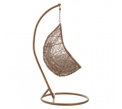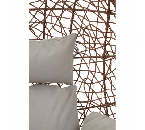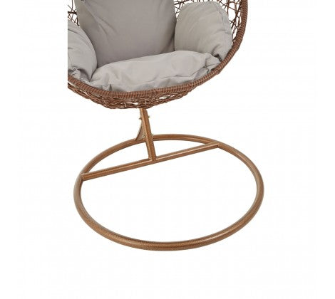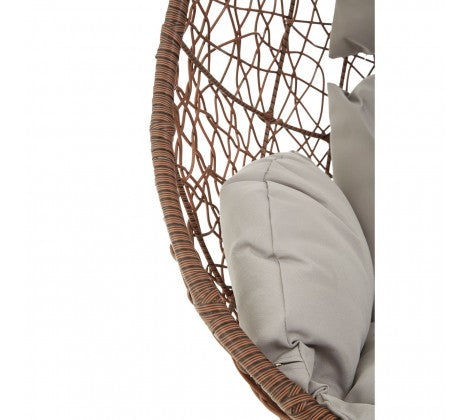 The brown hanging chair features hand-woven wicker, a sturdy iron frame and is ideal for comfortable lounging. This large brown hanging chair with grey cushion will be a striking focal point in an indoor living area. Position outside in summer months and enjoy the gentle swinging motion in the sun.