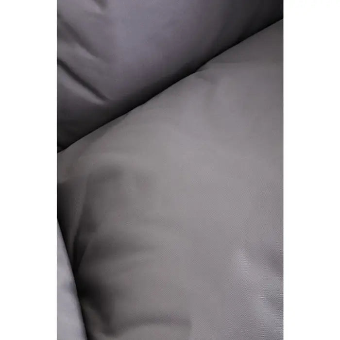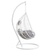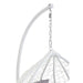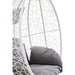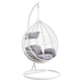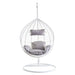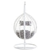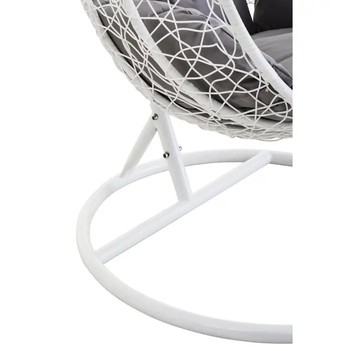 This hanging chair boasts a white rattan weave, harmonized by a grey cushion and a white metal frame giving it a contemporary aesthetic.