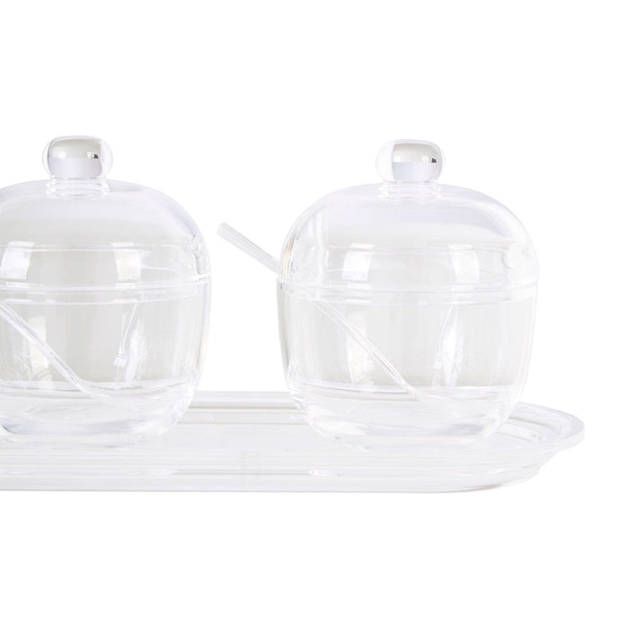 This set of vintage inspired storage canisters is versatile enough to store wet and dry ingredients. This set of 3 containers provides a quick and easy way to store a variety of ingredients. Each transparent canister has as a matching lid with spoon and rectangular tray while they combine to enhance the decorative accent.