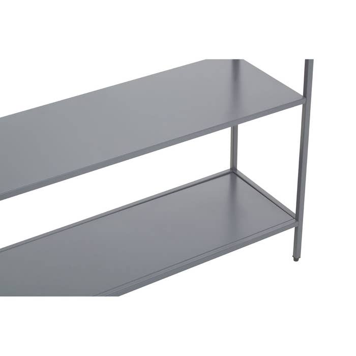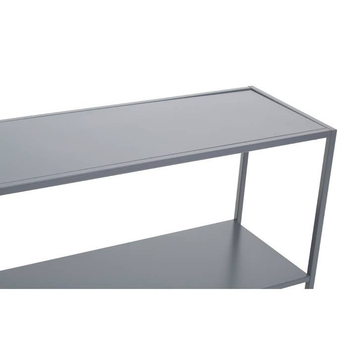 Constructed from durable metal and coated in a neutral grey colour, this console table provides ample open shelving for effortless organisation and showcasing. Its sleek legs and rectangular tabletop are supported by two lower shelves and an open section, resulting in a sleek and modern industrial aesthetic.