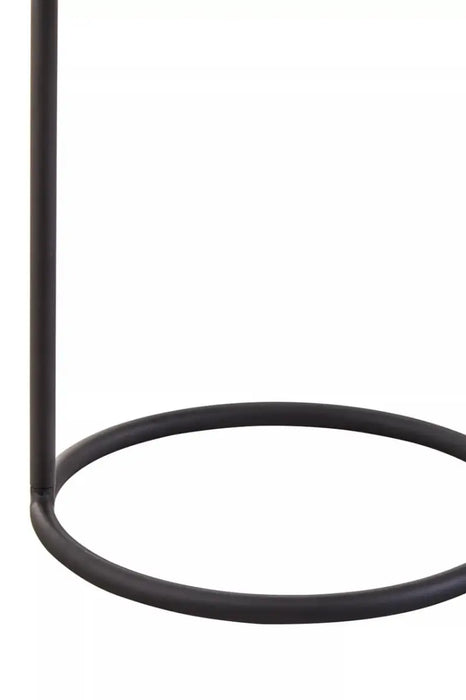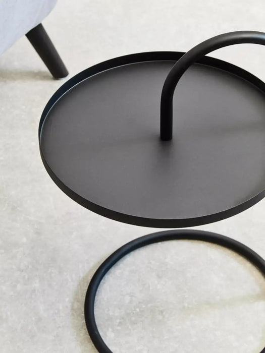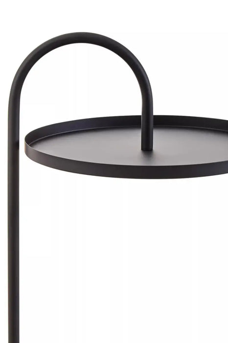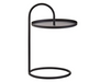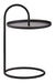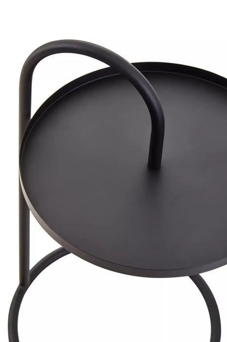 This side table is designed with a modern aesthetic, featuring a round black table top suspended by a contemporary black metal frame.