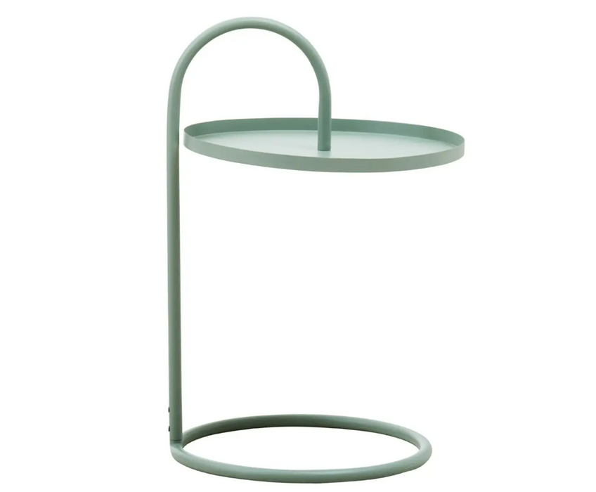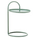 This side table is designed with a modern aesthetic, featuring a round green table top suspended by a contemporary green metal frame.
