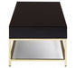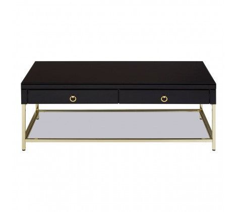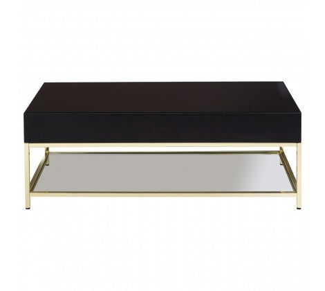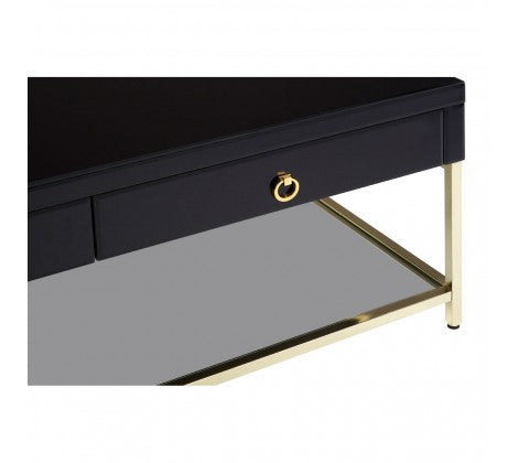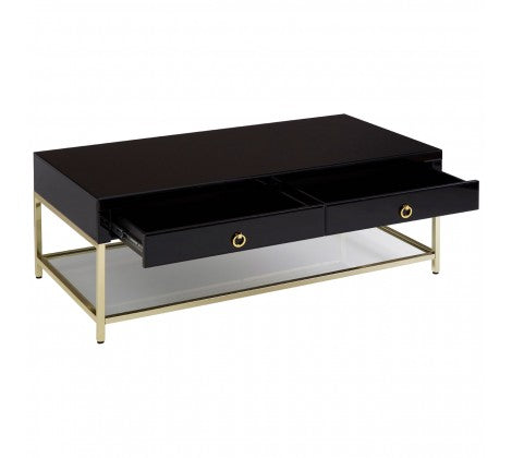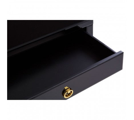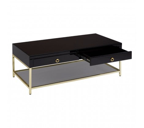 Bring luxe design to the living room with the Townhouse coffee table. The mirrored lower shelf offers a reflective counterpoint to the matte black top. A pair of slim drawers are integrated into the design, each one with a gold finish ring pull handle that matches the iron frame.