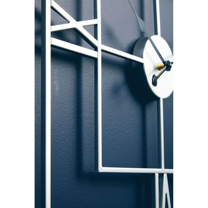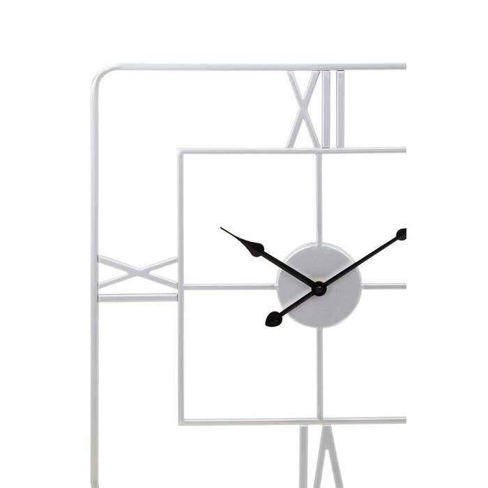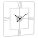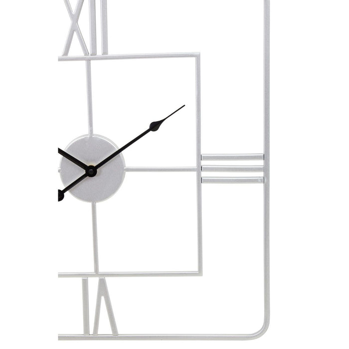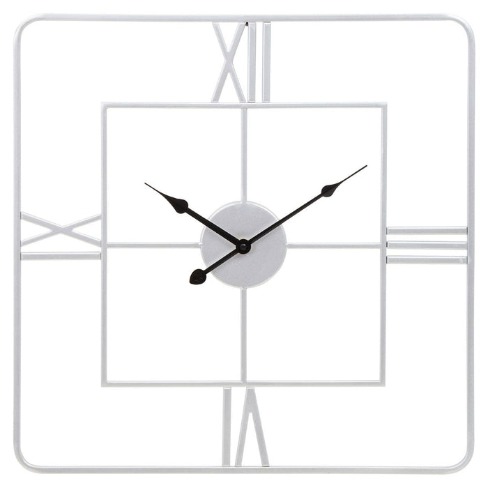This metal wall clock with a bright silver finish is a stylish accent. Large roman numerals adorn the square outer frame, which features a square inner frame in which the dial is set. Sleek black hands contrast the luxurious silver finish.