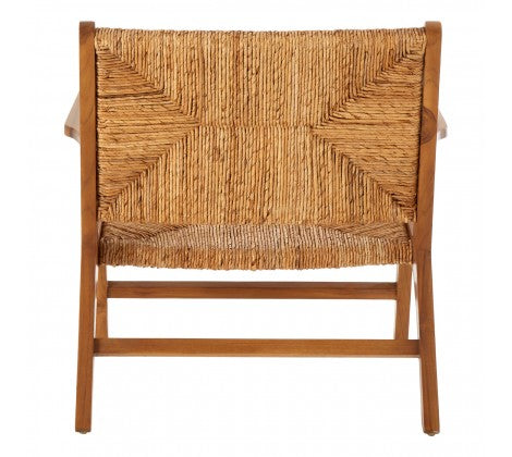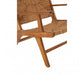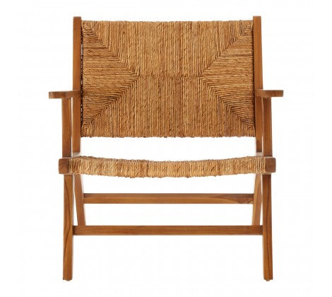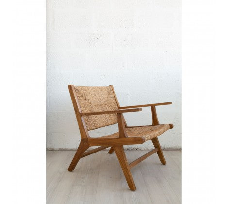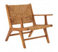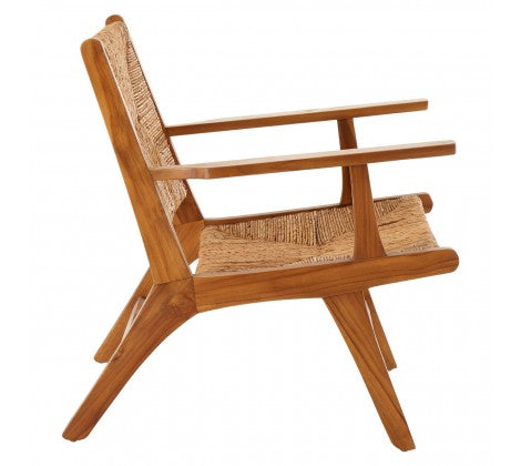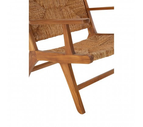 Embracing organic, minimalist design, the armchair boasts a relaxed silhouette with a subtly reclined backrest and slender carved arms. The contemporary armchair is crafted from teak wood and sustainable rattan, with the latter being woven to create a distinctively patterned seat and backrest.