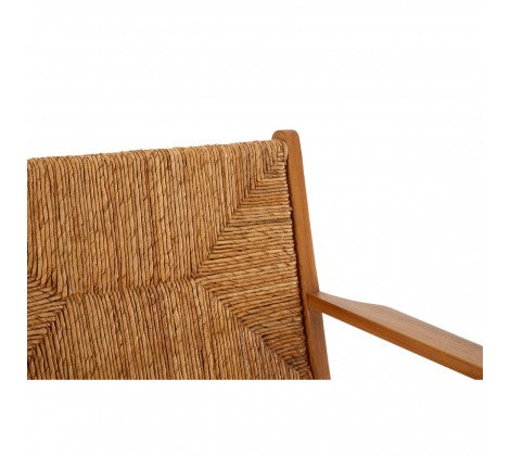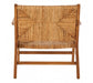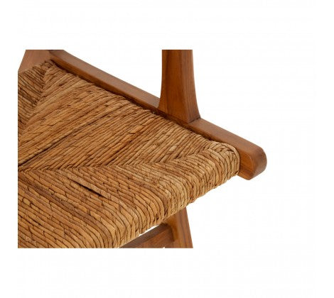 Embracing organic, minimalist design, the armchair boasts a relaxed silhouette with a subtly reclined backrest and slender carved arms. The contemporary armchair is crafted from teak wood and sustainable rattan, with the latter being woven to create a distinctively patterned seat and backrest.