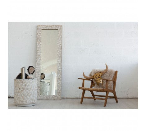The natural wood chair features rich grain patterns that enhance its organic appeal.