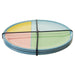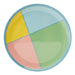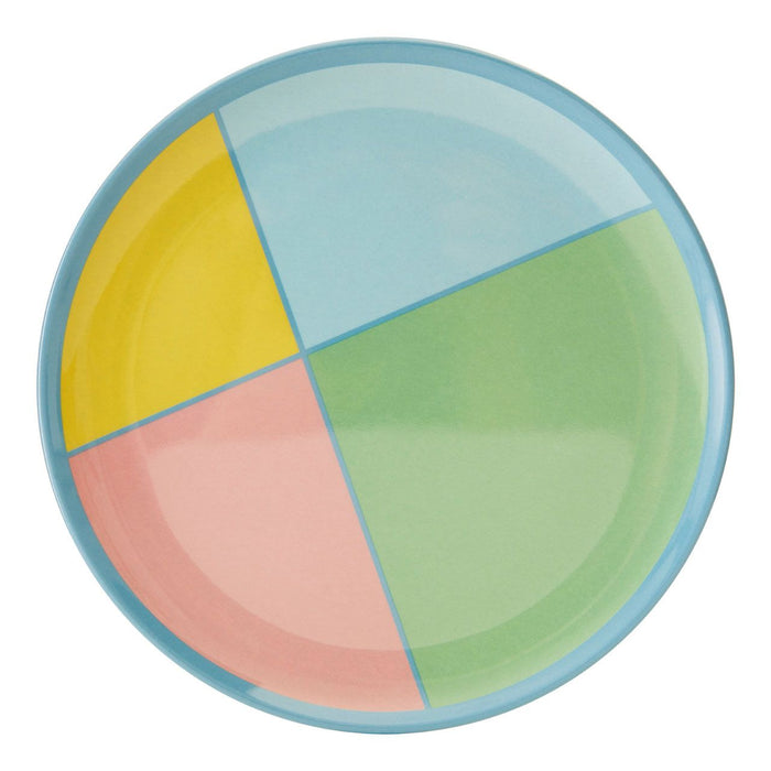 A colourful set of four dinner plates that can be used outdoors as well as indoors. Part of the Mimo collection, these round plates are made from durable, easy to clean melamine. Each one sports four triangular pastel shades with a blue finish rim, making it easy to brighten up the dinner or picnic table. The set comes with an elasticated string that fits over the plates when they're not being used.