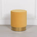 Mustard yellow velvet upholstered round stool with a gold trim base.