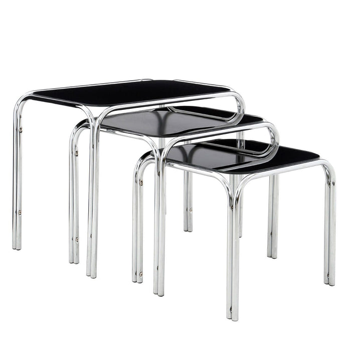 The sleek and stylish nest of 3 tables will not only add extra surface space when needed, but also a contemporary and elegant look to your room. Chic black glass is complemented by a chrome finish frame for that refined look. Elegant and modern, the nest of three tables are ideal for adding a contemporary and sophisticated look to your living area. Invite friends and family round for a get together and be the perfect host by having plenty of surface space for serving food and drinks. The chic black glass is smooth and durable for all sorts of items including plates, cups, flowers, plants, photo's and lamps. Complementing the black glass is the chrome finish frame that adds an elegant look to your living area. The tables stack neatly for storage allowing you to bring out one, or all three, when required. Sturdy enough for everyday use, the purposeful and polished nest of tables is an ideal addition to your home.
