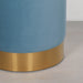 Ocean blue velvet upholstered round stool with a gold trim base.