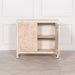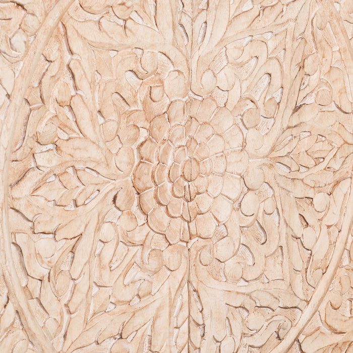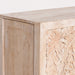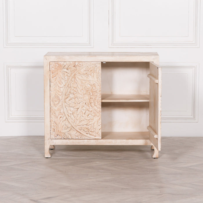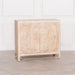 Two-door cupboard handcrafted with mango wood in an aged rustic design. Ornately carved detailing on the doors with internal shelving.