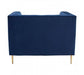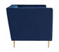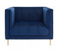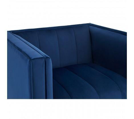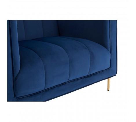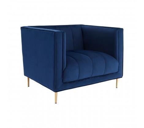Upholstered in plush blue velvet, this armchair comes in thick padding featuring minimal channel detail. The warm metallic stainless steel base furthers the luxe accent and harmonises with vertical lines along with the seat and backrest.