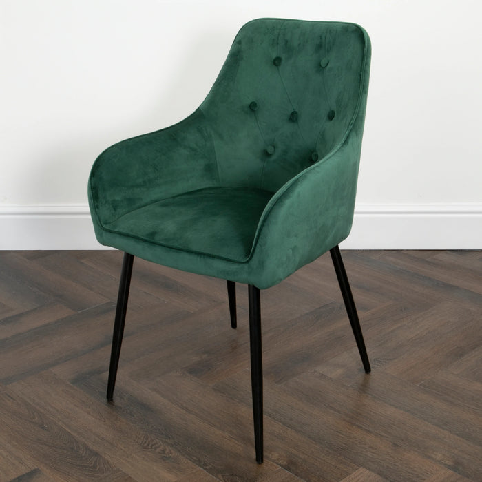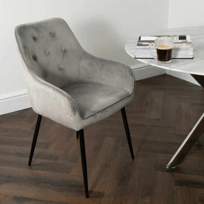 This timeless design is sure to look gorgeous by any dining table, the neutral shade of grey keeps it looking elegant. Finished with a button back and black tapered legs.