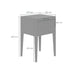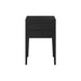 Two drawer black bedside table, solid oak and oak veneer, drawers on metal runners, tapered legs, visible grain, round handles