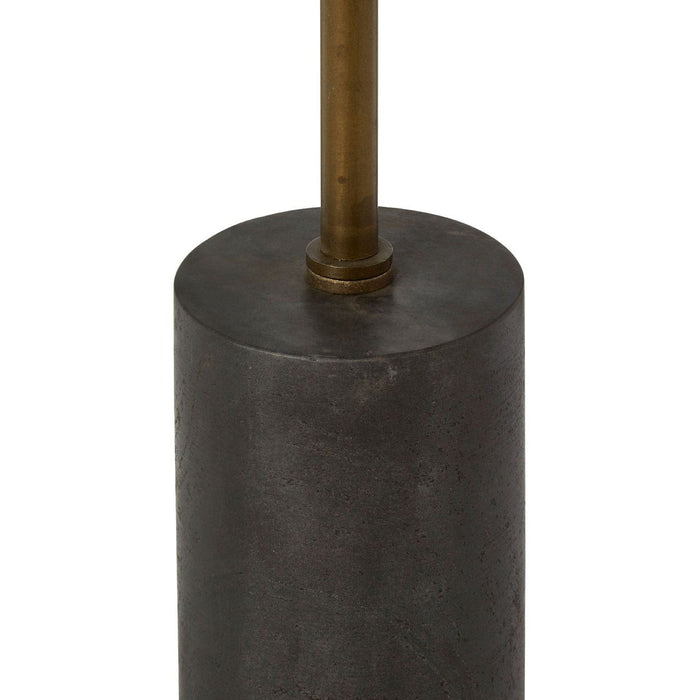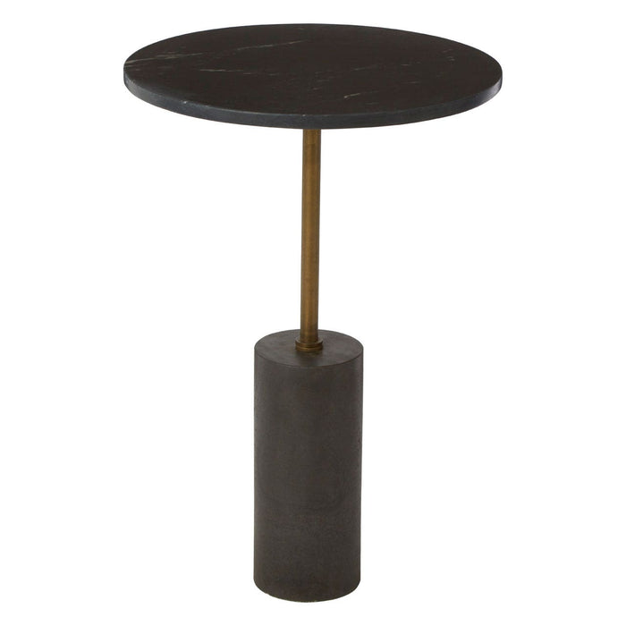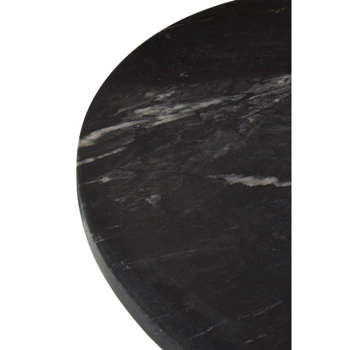 Incorporate a touch of natural luxury into the living room with the Rany black marble side table. The cylindrical base and round top are both crafted from solid marble. The marble has a black colour with delicate white veining creating a textured look. A simple iron pole completes the structure, coloured antique brass to complement the black.