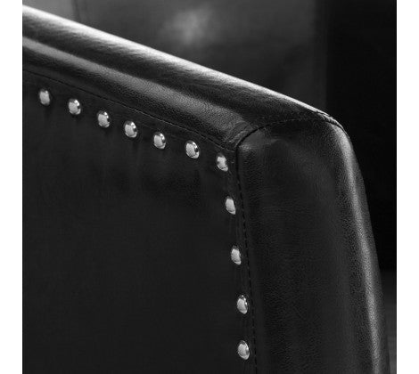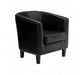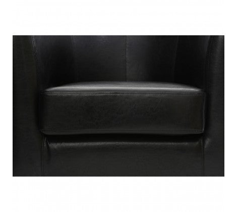Bringing a regal touch to your home, the traditionally designed tub chair from our Regents Park range, will give your room substance, style and total comfort. The solid and sturdy frame is made from robust wood ensuring durability, while being upholstered in black leather effect guarantees a soft to the touch feel. The tub design will embrace your body, while the padding helps to caress you when seated. Four sturdy rubberwood legs, with a matching dark wood finish, enhance the regal design, while making sure that the chair is stable. Stud detail outlines the edge of the chair accentuating its grandeur design. A wonderful feature in your bedroom or living space, the tub chair will create an eye-catching piece of furniture in your room. Enveloping your body for total comfort, the beautifully styled tub chair from our Regent Park collection complements most decors, bringing its own grandiose to the setting.