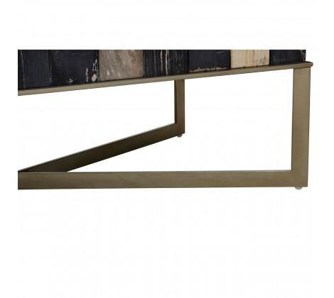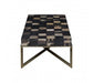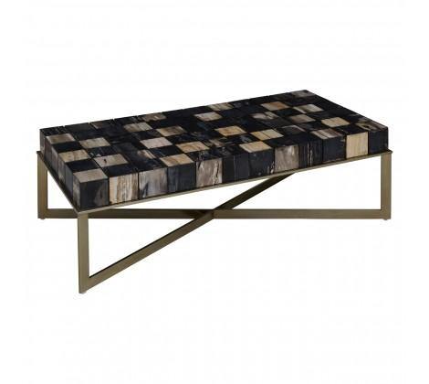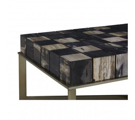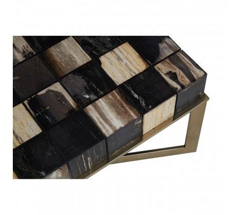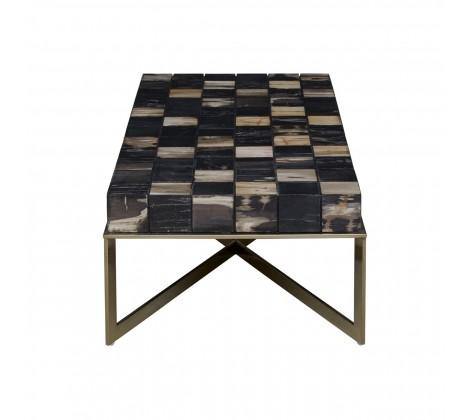 Crafted from petrified wood fossils, this coffee tabletop brings warmth and character in individually carved wooden blocks, formed into a checkerboard pattern, in black and natural hues. Brass finish stainless steel legs extend to combine and form a cross-leg base, adding to the geometric element.