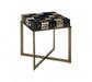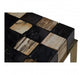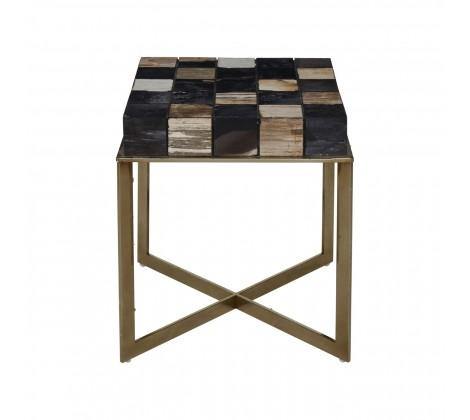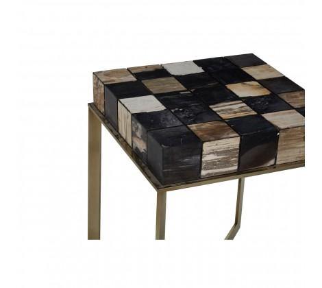 Crafted from petrified wood fossils, this tabletop brings warmth and character in individually carved wooden blocks, formed into a checkerboard pattern, in black and natural hues. Brass finish stainless steel legs extend to combine and form a cross-leg base, adding to the geometric element.