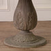 Round 120cm pedestal acorn dining table handcrafted from reclaimed wood in a dark rustic finish with an intricately hand-carved base.