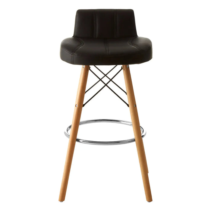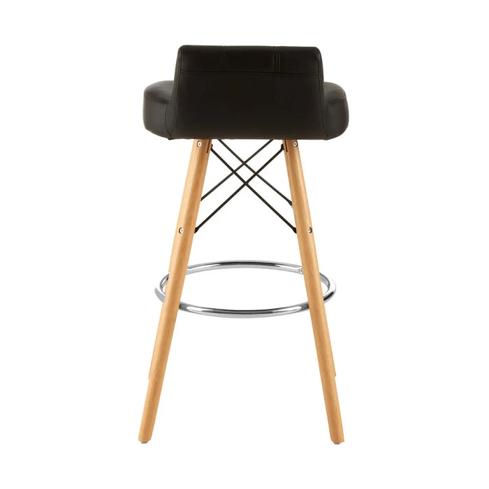 The seat has a black finish and is upholstered in soft faux leather. Further support is provided by a curved backrest, and the stitched design gives it a textured appearance. The legs have a faint grain pattern, a clear lacquer covering, and are constructed from solid beechwood. The design has a footrest with a silver finish.