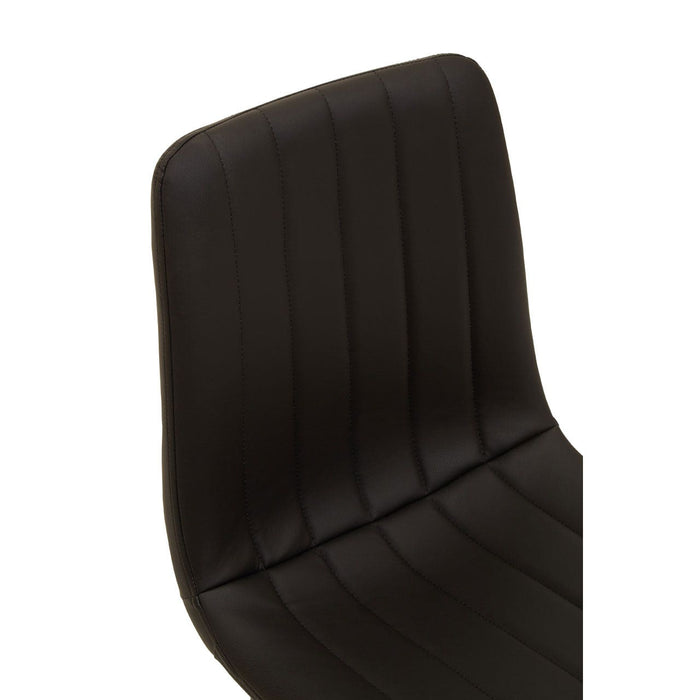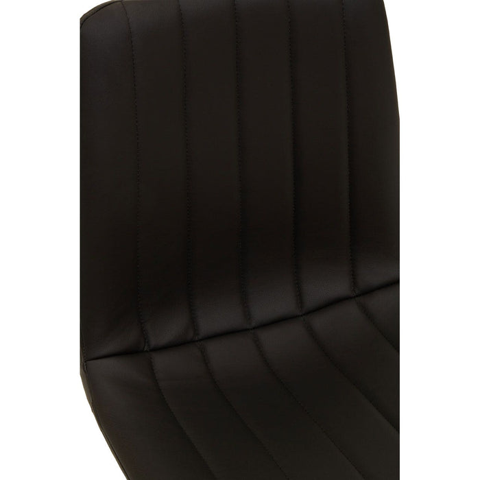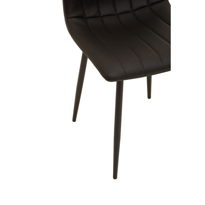 This set of 4 dining chairs features nordic minimalist style with clean lines and stitched detailing. Upholstered in black PU fabric, this chair features foam filled bucket seat that contributes to its comfort and aesthetic. Decorative channel detail enhances sophistication while angular legs accentuate modern minimalism of the design.