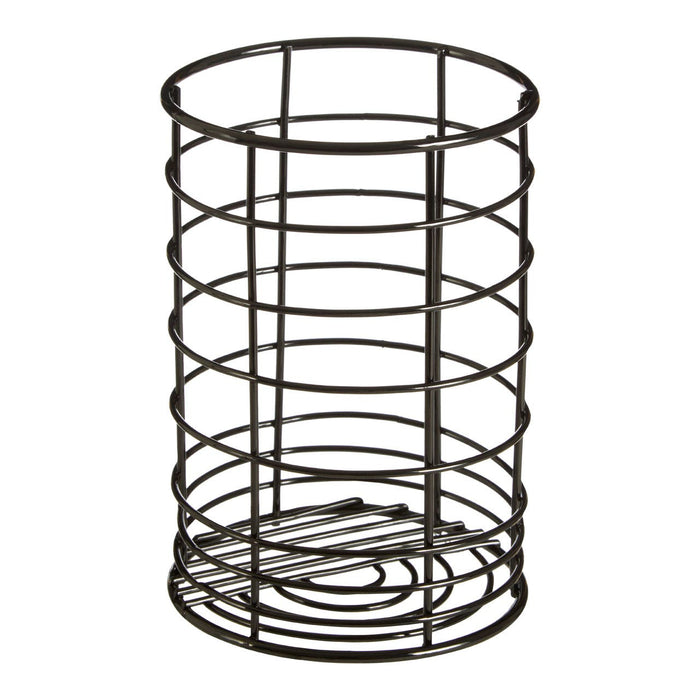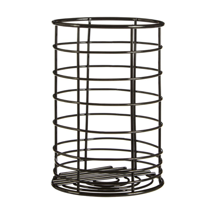 A cylindrical wireframe utensil holder that adds a contemporary touch to kitchen worktops. The Vertex utensil holder is made from tough iron and has a nickel coating that enhances its durability. The straight lines that feature on half of its base subvert its round aesthetic. Its cylindrical design allows utensils to be stored in an upright position, while the black finish gives it a sleek look.