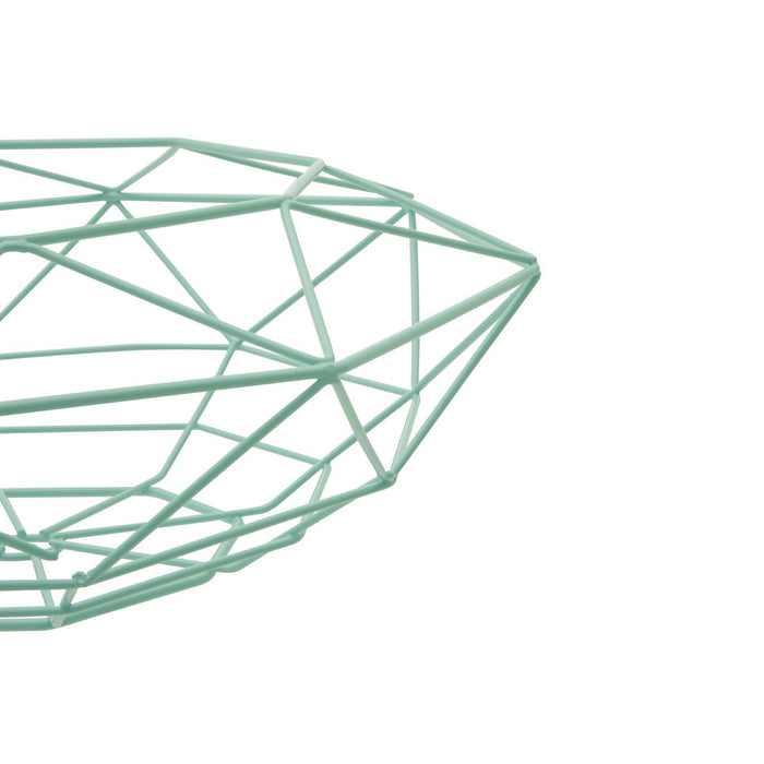 This contemporary fruit basket uses slim wires to create a distinctive geometric lattice. Made from strong iron, the Vertex fruit basket's minimalist wireframe construction boasts a bright green finish. The geometric design results in two layers of triangles that combine to form a polygonal bowl shape. The tapered design allows it to hold fruit securely. Small rounded feet raise the fruit bowl from the surface of the table or worktop.