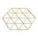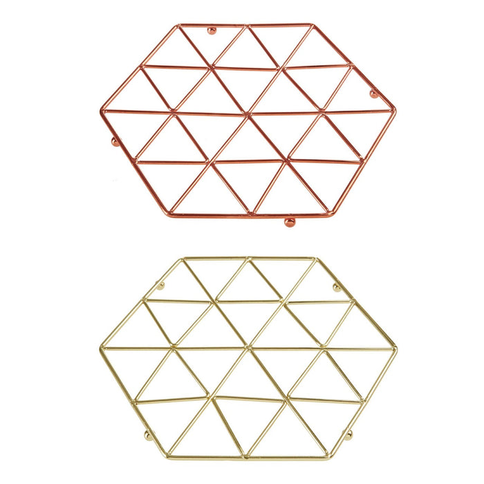 Ensure kitchen worktops are protected from hot pans with the polygonal Vertex trivet. Forming the shape of a hexagon, the strong iron wire frame features a warm gold plated finish that coordinates well with the Vertex utensil holder. Its series of triangular shapes combine to form a pleasing geometric pattern. Four small feet keep it slightly raised from kitchen surfaces, allowing air to circulate under the pot or pan.