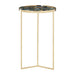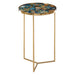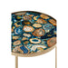 The Vita table is a contemporary combination of minimal design lines and colourful pattern. Its round top is made from natural agate stone, a semi-precious material desirable for the crystalline pattern that has been formed over millennia. The agate has been polished to make it smooth to the touch, and set into a round frame made from gold coloured steel. The three legs have a minimal design and join together at the base.