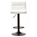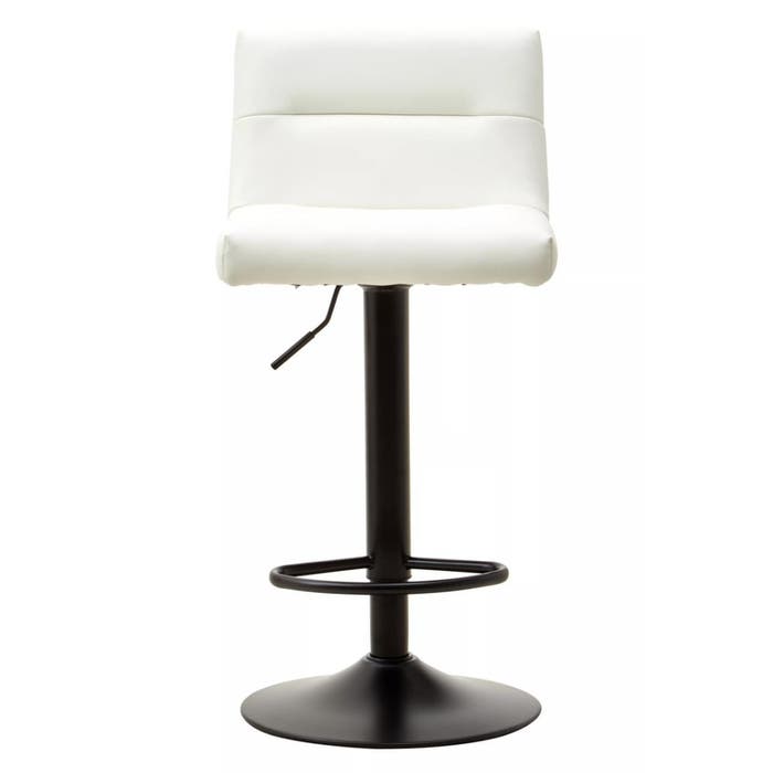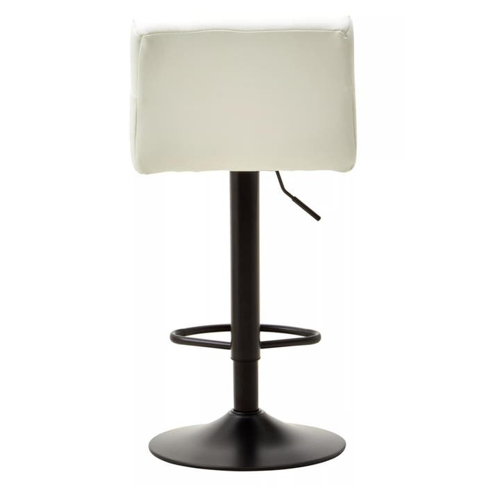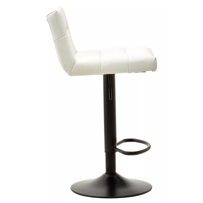 The white leather effect upholstery of this bar stool features subtle horizontal tufting, while the low back provides both style and back support. The black metal base includes a footrest for added comfort while seated.