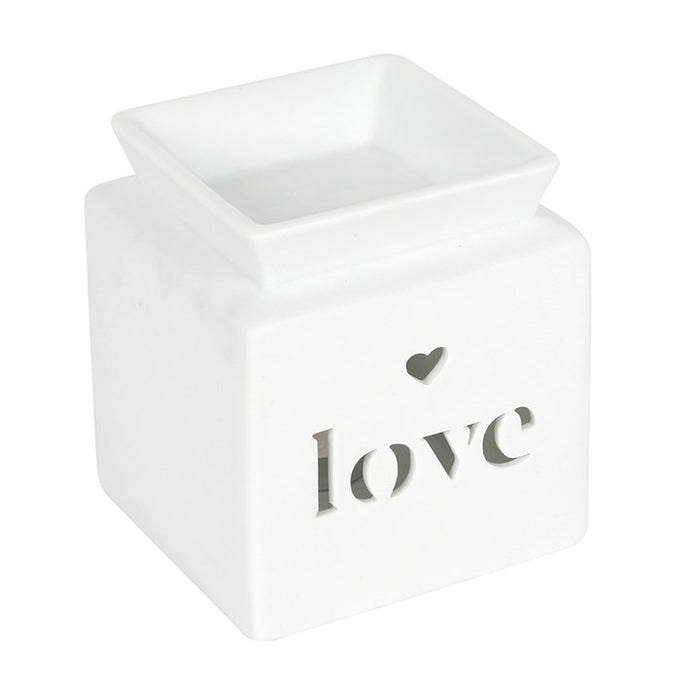 This white ceramic oil burner features a cutout heart and 'love' text in a cute, contemporary design. Place fragrance oil or wax melts into the built-in dish with a standard tealight inside to fill the home with calming fragrance.
