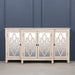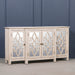 Wooden breakfront 4 door mirrored sideboard with internal shelves and brass style handles. Finished in a blanche wooden rustic finish.