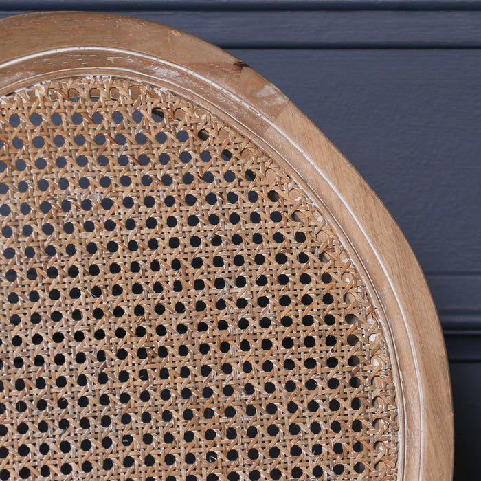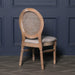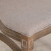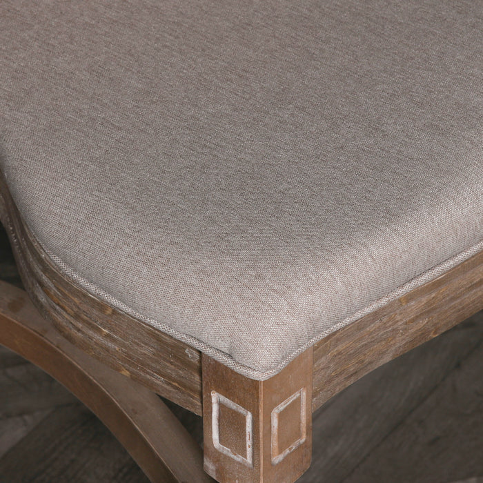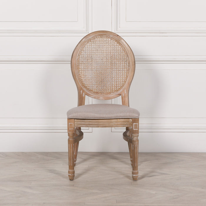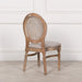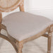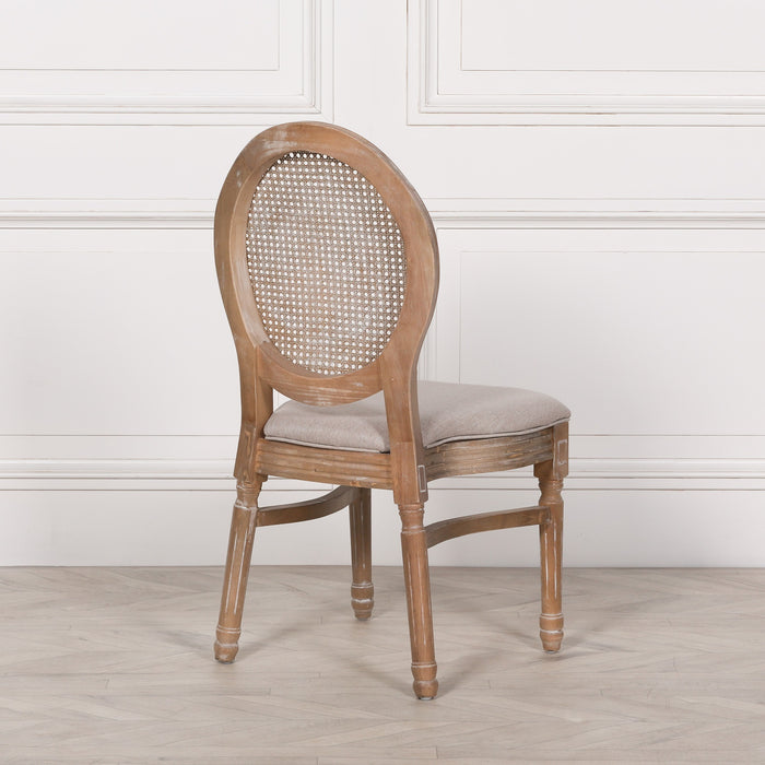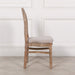 Wooden Louis dining chair in wooden finish with light washing added to the detail of the frame. Finished with a linen upholstered seat top. Dining chair is stackable.