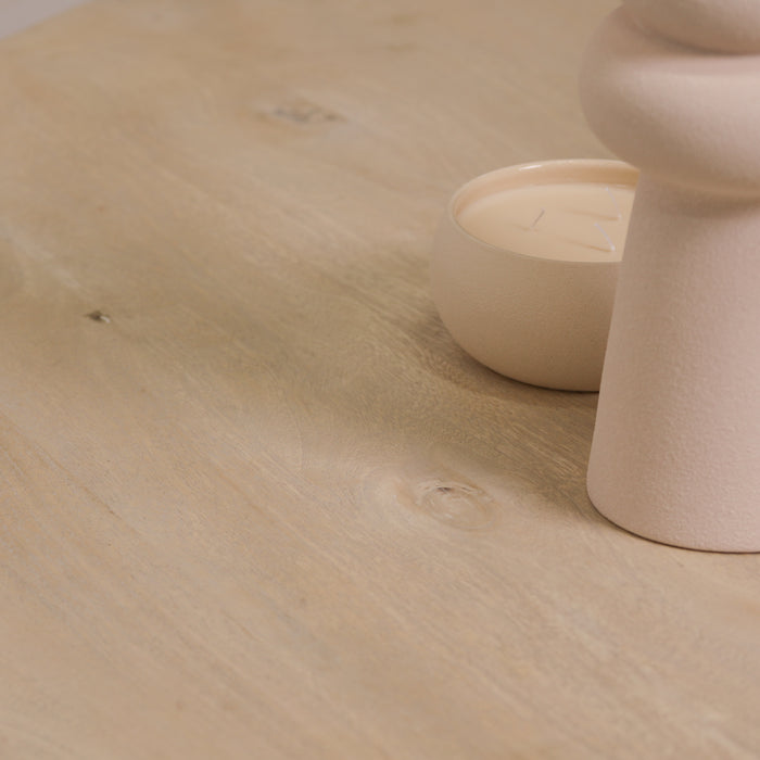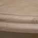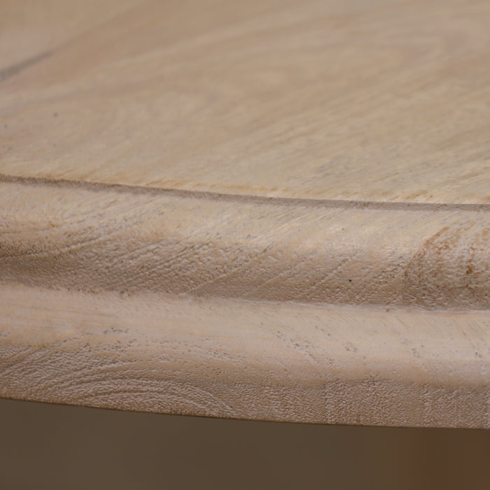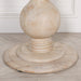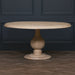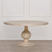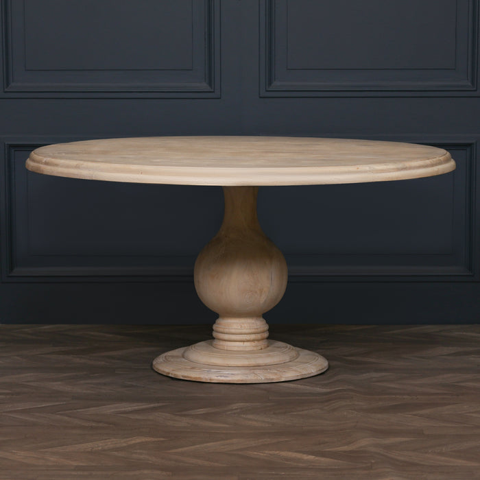 Round 152cm dining table handcrafted from mango in a bleached wood finish with subtle pale grey wash over the wood. The table has a rounded hand-carved detailed columned base.